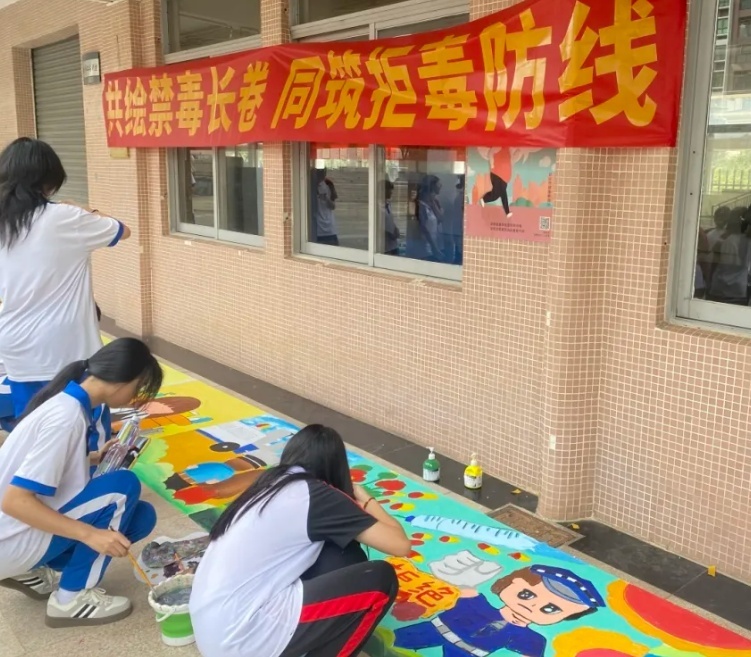 在学校美术老师的指导下,同学们围坐一圈,化身“小小艺术家”,将禁毒元素融入长达20米画卷中。调色盘上流转斑斓色彩,画面间跃动创意火花,欢声笑语中,“健康人生,绿色无毒”的理念一笔笔绘入童心。