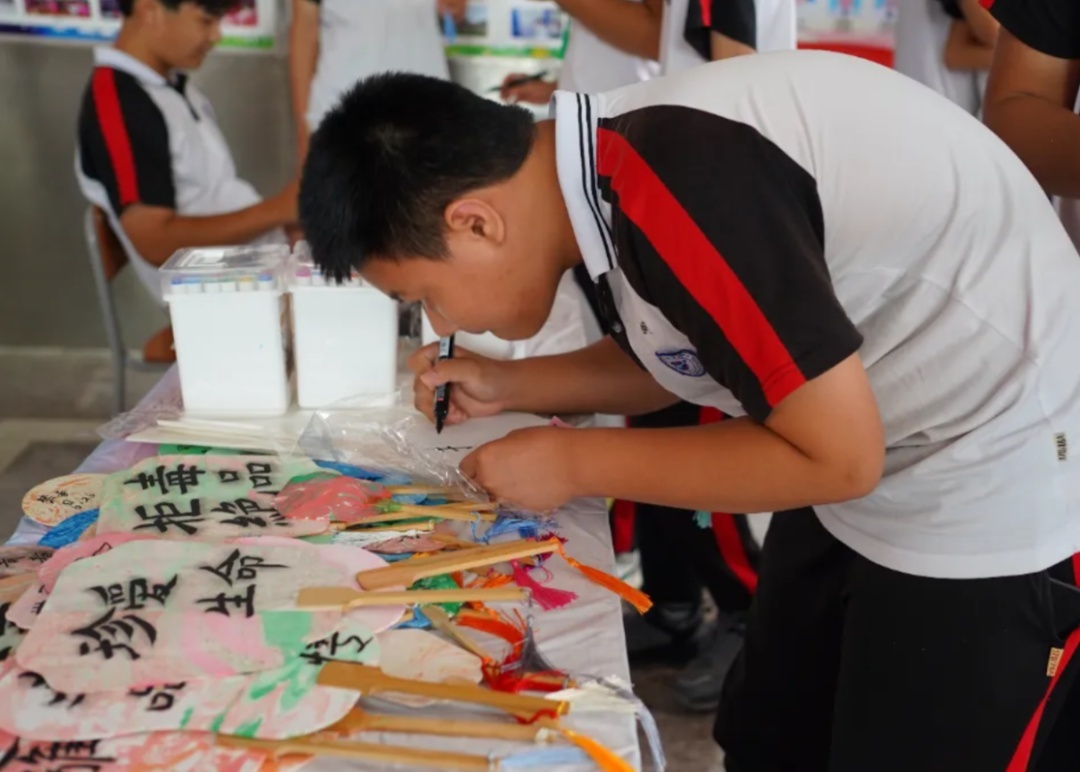 活动现场,在技工学校老师的指导下,学生们通过泼、洒、滴、流等手法,让漆液在水面上形成独特纹理,然后将印有“珍爱生命 拒绝毒品”字样的扇面浸入水中,绘制出一面面各具风韵、独一无二的禁毒漆扇,用禁毒漆扇扇走毒霾,让禁毒知识流入学生心间。