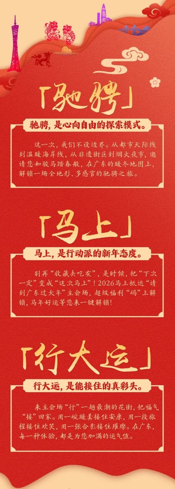 马年新春将至,记者获悉,广东省文化和旅游厅新近发布了将于1月23日举办的2026“请到广东过大年”文化和旅游消费促进主会场活动主题——“驰骋广东年 马上行大运”,邀请四海宾朋共赴南粤暖冬、喜迎祥瑞新年。